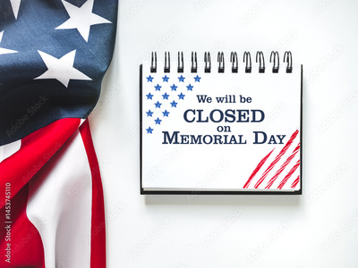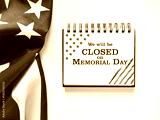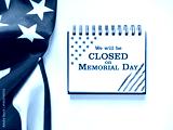 We will be closed on Memorial Day. American Flag and sign board with the inscription. Closeup, no people. Congratulations for family, relatives, friends, colleagues