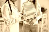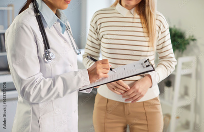 Consulting, making notes, results checking in feminist health clinic, supporting caring female doctor meeting, greeting, consulting young woman patient, offering medical advice in gynecology