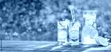 Lemonade in a pitcher and glass with ice, sliced lemon and mint on a wooden table outside. Long banner format. copy space