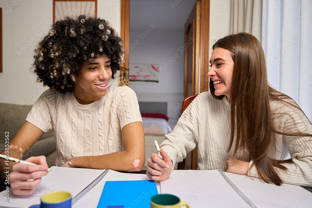 Two female university students collaborating on a project at home, sharing ideas and smiling