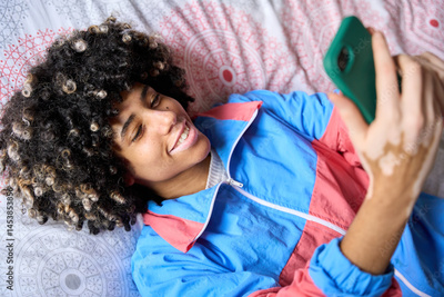 Young student using smartphone lying on bed at home