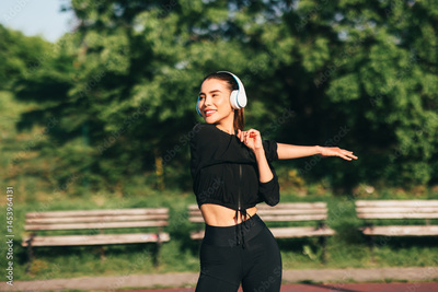 Fitness model stretching her arms while listening to music with headphones in a park