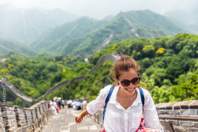 china travel at Great Wall. Tourist in Asia walking on famous Chinese tourist destination and attraction in Badaling north of Beijing. Woman traveler hiking great wall enjoying her summer vacation.