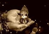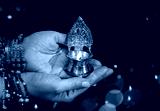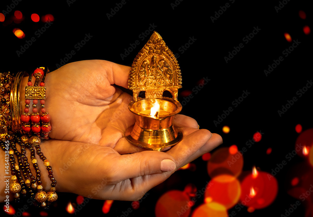 Hands with Lakshmi lamp diya or Deepavali Deepawali. Hindu festival of lights. Celebrating in Indian religions Jainism and Sikhism. Offering to the gods, a spiritual rite. Close up view, out of focus