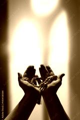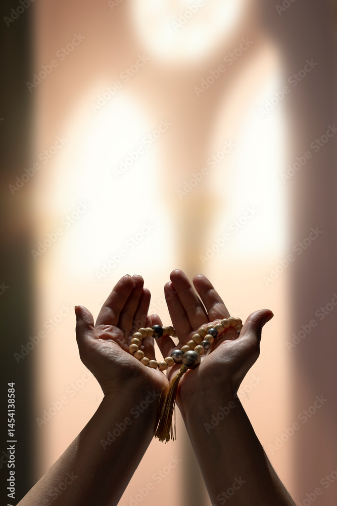 Prayer Salah or Namaz. Praying women's hands with wooden rosary. Concept of Muslim religion.