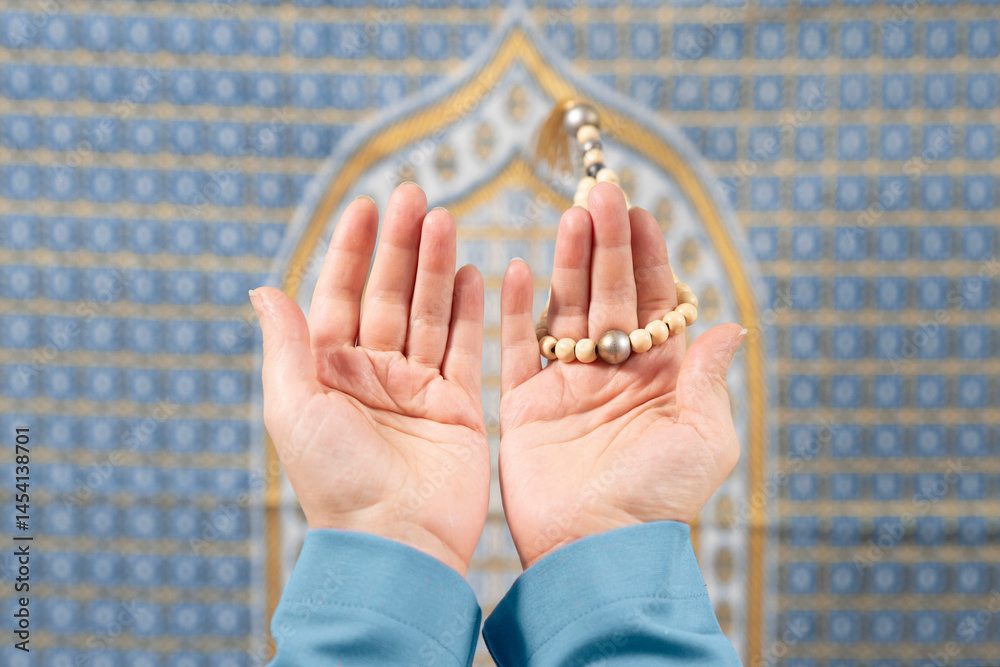 Prayer Salah or Namaz. Praying women's hands with wooden rosary with a prayer rug in the background below. Concept of Muslim religion.
