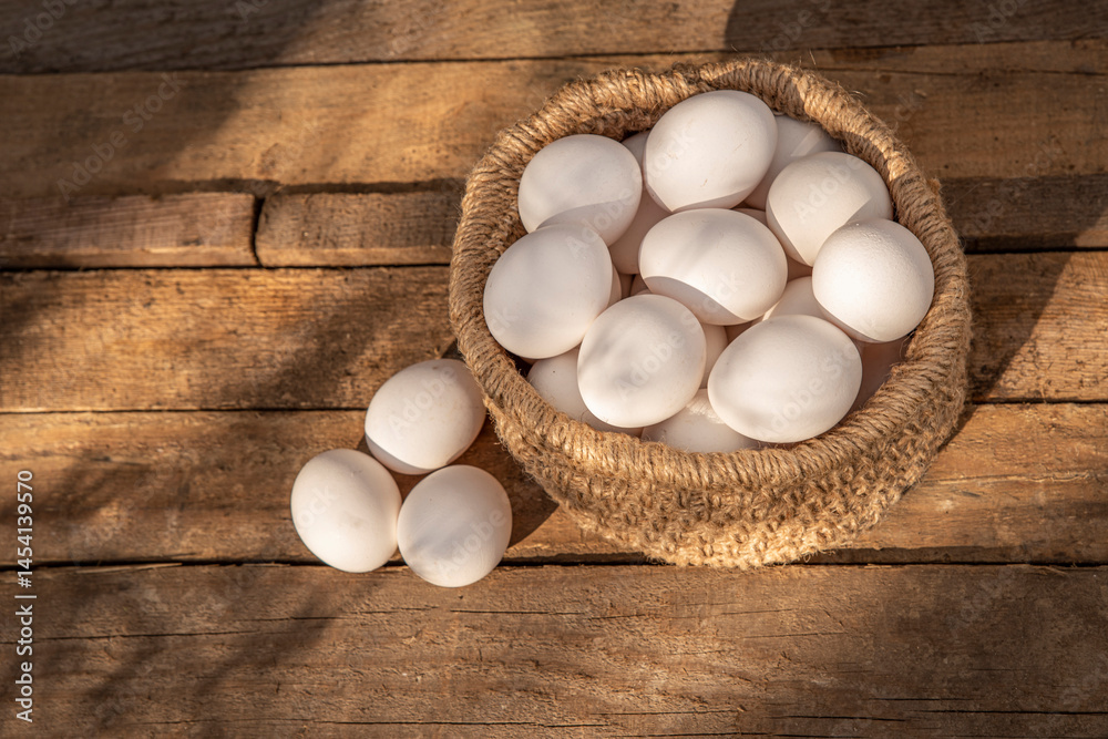 Chicken eggs in Crochet jute bowl on wooden grunge table in chicken coop, barn. Countryside outdoor setting in the backyard