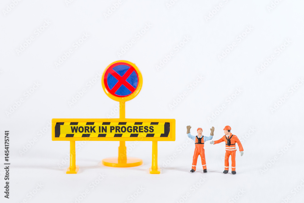 Miniature worker with work in progress sign isolate on white background, construction industry concept