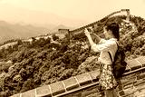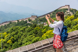 Great Wall of china. Tourist taking photo at famous Badaling during travel vacation holidays at Chinese tourist destination. Woman tourist taking picture using smart phone in Asia.