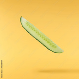 Fresh raw cucumber falling in the air isolated on yellow background. Food levitation or zero gravity conception