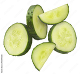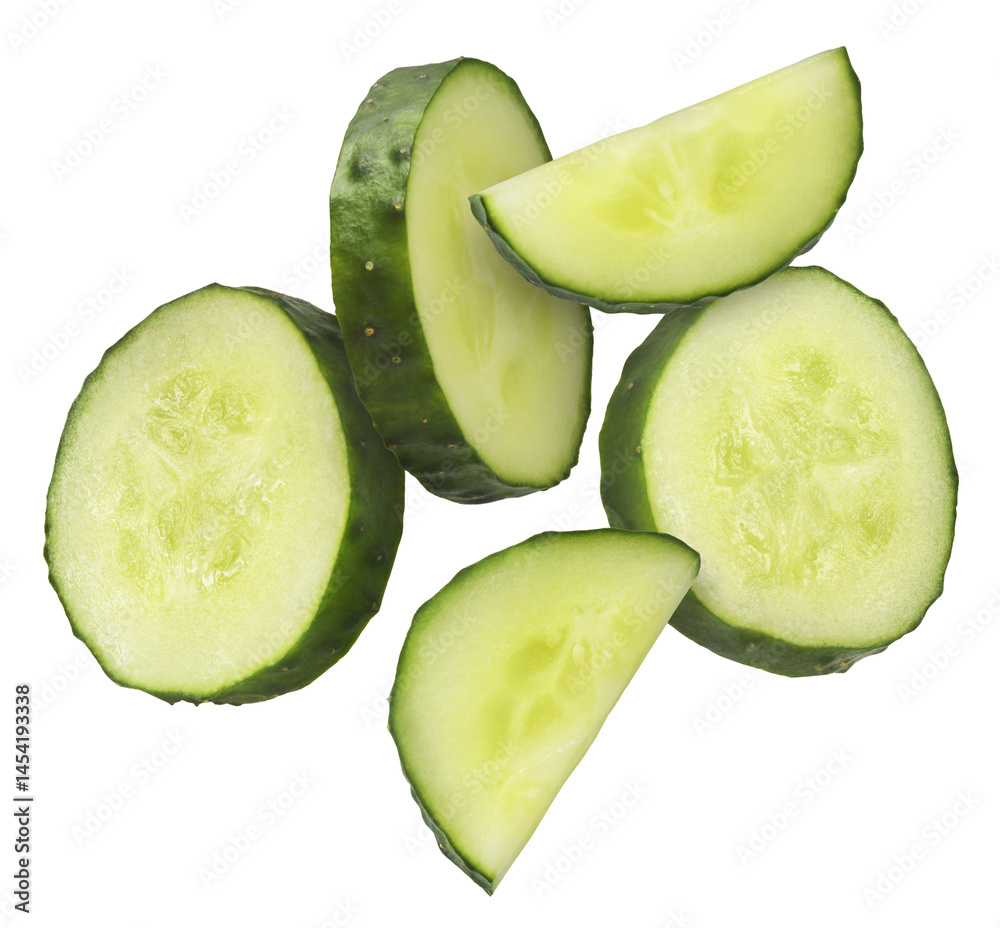 Fresh raw cucumber falling in the air isolated on white background. Food levitation or zero gravity conception