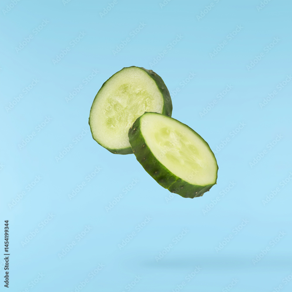 Fresh raw cucumber falling in the air isolated on blue background. Food levitation or zero gravity conception