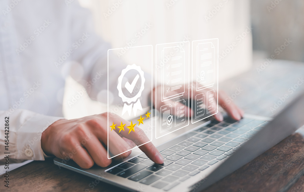 Hand shows sign of top service Quality assurance, Guarantee, Standards, ISO certification and standardization concept, satisfaction, service experience, show the standards of products and services.