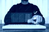 Business Performance Checklist Businessman Using Laptop Doing Online Checklist Survey On Computer Filling Out Digital Form Checklist Survey Doing Assessment Questionnaire Evaluation