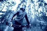 Young attractive man wears yellow suit ride the bike on the forest road