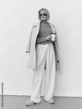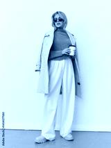 Elegant woman poses in contemporary fashion with coffee in stylish studio setting