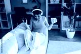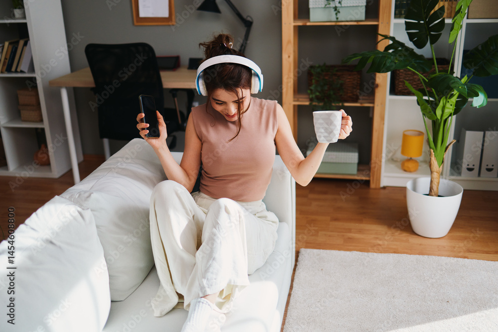 Happy woman listening music with headphones and drinking coffee on sofa at home