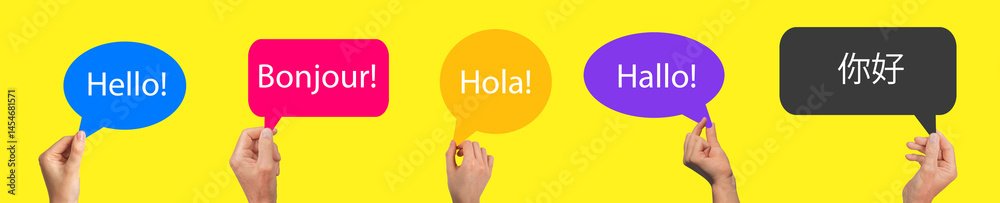 Speech bubbles in hands with foreign languages. Greeting word Hello in English, French, Spanish,