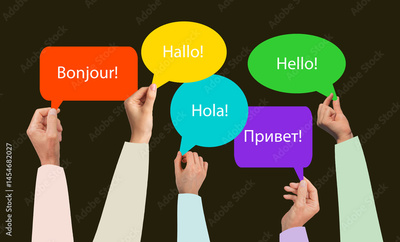 Hands group holding diverse speech bubbles with Hello in various languages. French, English, Spanish