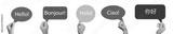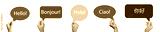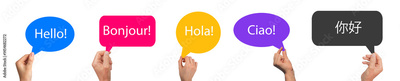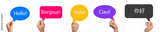 Hand holding a speech bubble with different languages. Hello word in English, French, Spanish,