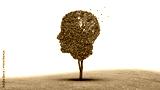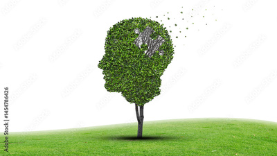Puzzle head brain mental health symbol concept. Tree in a shape of human head face profile with jigsaw piece cut out on blue sky background.
