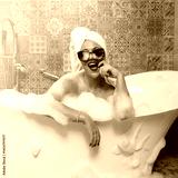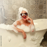 Woman with her hair wrapped in white towel enjoying a hot bath with bubbles and foam in modern tub in luxury bathroom. Self-care, wellness, hygiene and healthy lifestyle concept.