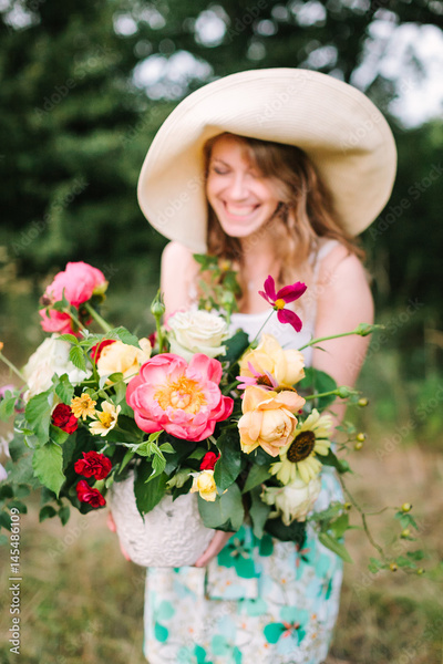 bouquet, people, flower holidays , gift and floral arrangement concept - close-up on beautiful fresh bouquet, smiling young woman in fancy hat holding vase with summer flowers at nature background