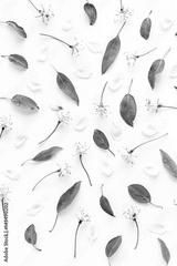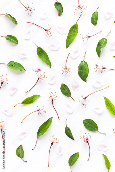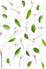 white background filled with uniformly but symmetrically arranged sakura flowers and leaves. Flat lay. top view. concept of spring, lightness and elegance.