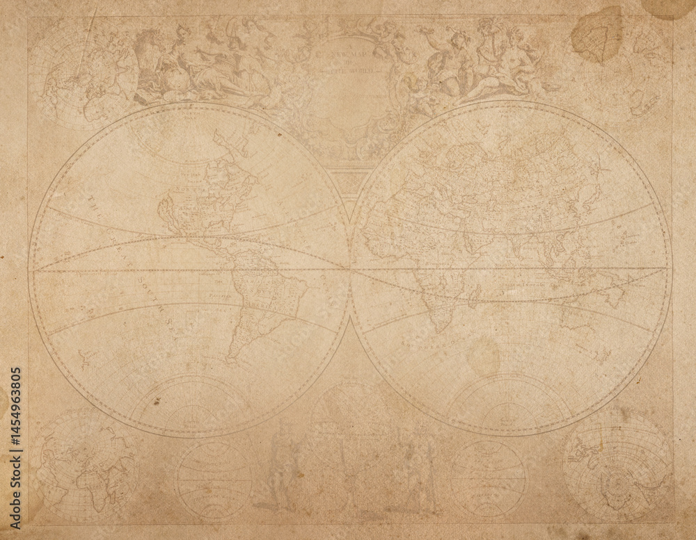 Old map of the world of the 18 century. Collage. A good background for design on the theme of travel, geography, history, voyage, etc.