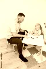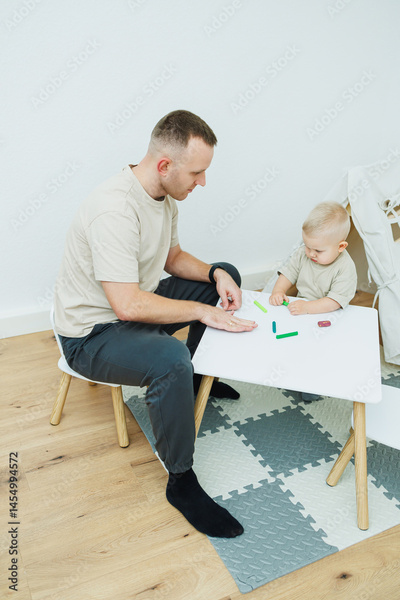 Dad teaches his 1.6 year old son to sculpt from plasticine. The toddler boy sits at the children's table with his dad and plays entertaining games. The child sculpts figures from plasticine