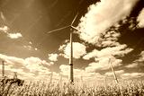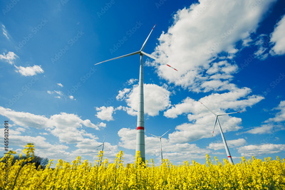 Wind turbines in a yellow field against a blue sky. Ecological energy production by windmills in rural areas in Europe.