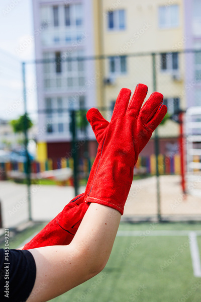 Rough gloves on men's hands for a construction worker. Construction gloves. Durable gloves for dirty work. Garden gloves. Rubberized construction gloves.