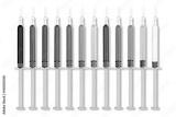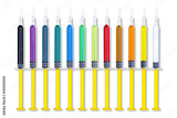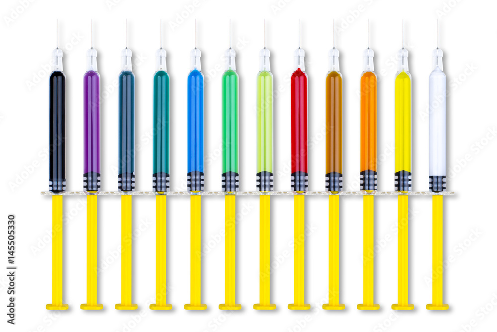 Multiple syringes with needles, filled with various colours of medicine/vaccines. Isolated on white. Path included.