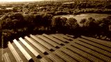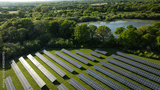 An expansive solar panel farm nestles in the green, serene landscape by a sparkling lake.