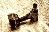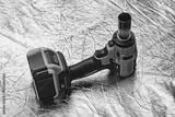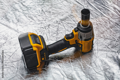 Cordless impact wrench rests on a reflective metallic background. Power tools in construction, automotive, or DIY project.