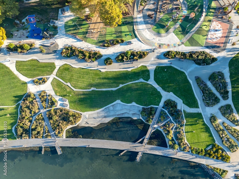 Aerial view of Rotorua, New Zealand, showcasing the city's urban landscape and the scenic Lake Rotorua. People enjoy the park, highlighting the city's blend of nature and urban life.