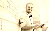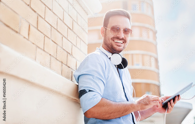 Portrait of handsome smiling man with tablet. Listening to music. Technology, lifestyle concept