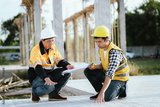 Engineers and contractors discussing blueprints on construction site—teamwork, safety, and innovation driving industrial development and architectural progress