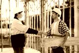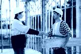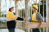 Engineers and contractors discussing blueprints on construction site—teamwork, safety, and innovation driving industrial development and architectural progress