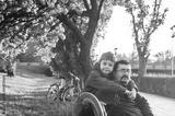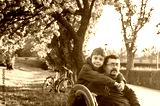 Father and son are sitting on a bench under a cherry blossom