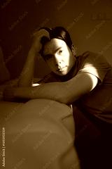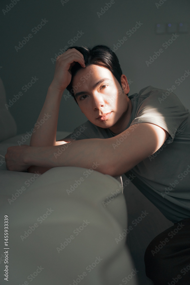 Young man leans thoughtfully on a light-colored couch in a softly lit room during the afternoon