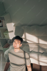 Young man relaxes in a sunlit room, creating a peaceful atmosphere with soft shadows