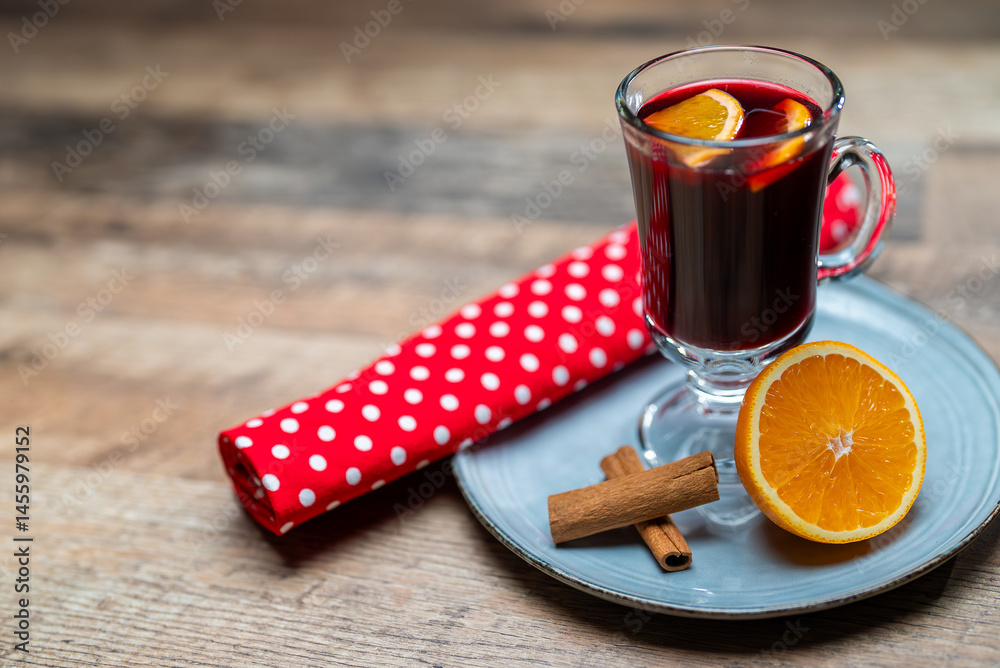 Hot mulled wine with cinnamon stick and orange slice