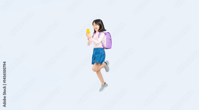 スマホを使いながらジャンプするランドセルを背負った小学生の女の子の全身写真(切り抜き背景透過PNGも販売しております。↓作成者リンクから「PNG」で検索してください)