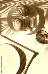 Plate with lemon fruits on the white plaster background with yellow striped pattern napkin with tropical palm leaves shadows. Summer table setting. Copy space
