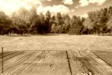 Empty wooden podium with copy space for showcasing eco-friendly or sustainable products and solar panels on lush green field background. Renewable energy and environmental protection concept.