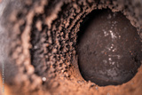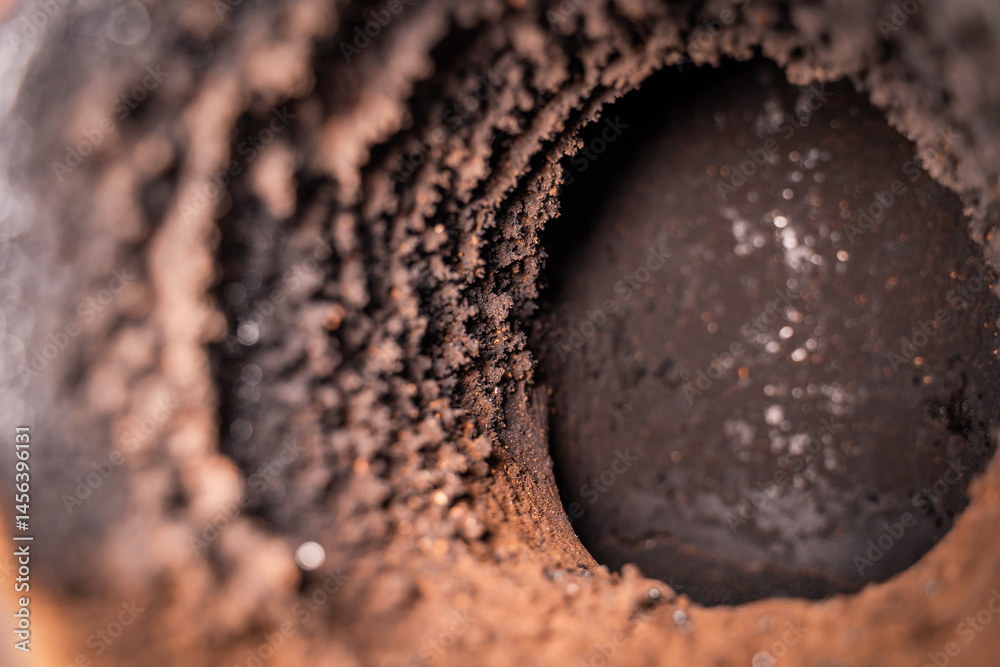 Pipe in the wall for connecting a fireplace. Chimney pipe in the wall, close-up. Soot on the inside of the pipe, maintenance and cleaning