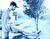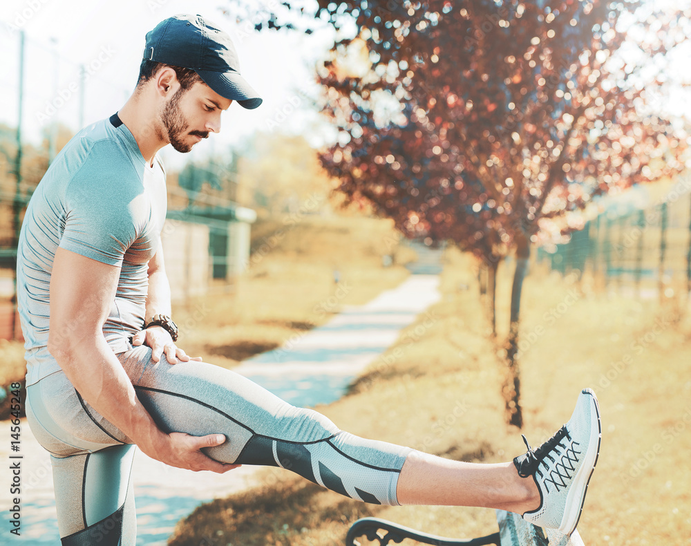 Fitness training outdoors. Sportsman stretching his body after training. Sport concept