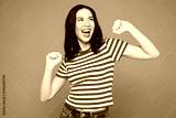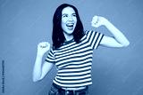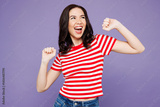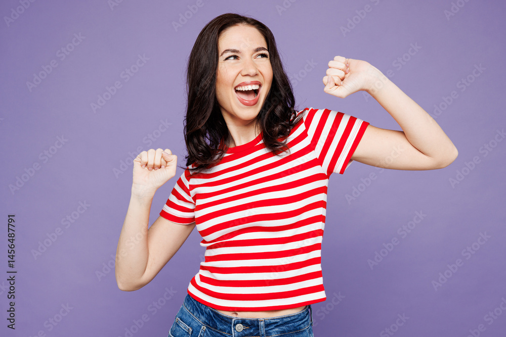 Young Caucasian woman wear red striped t-shirt casual clothes doing winner gesture celebrate clenching fists dancing isolated on plain pastel light purple background studio portrait Lifestyle concept
