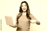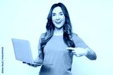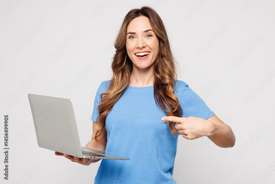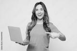 Young surprised shocked IT woman wears blue t-shirt casual clothes hold use work point finger on laptop pc computer isolated on plain solid white color background studio portrait. Lifestyle concept.